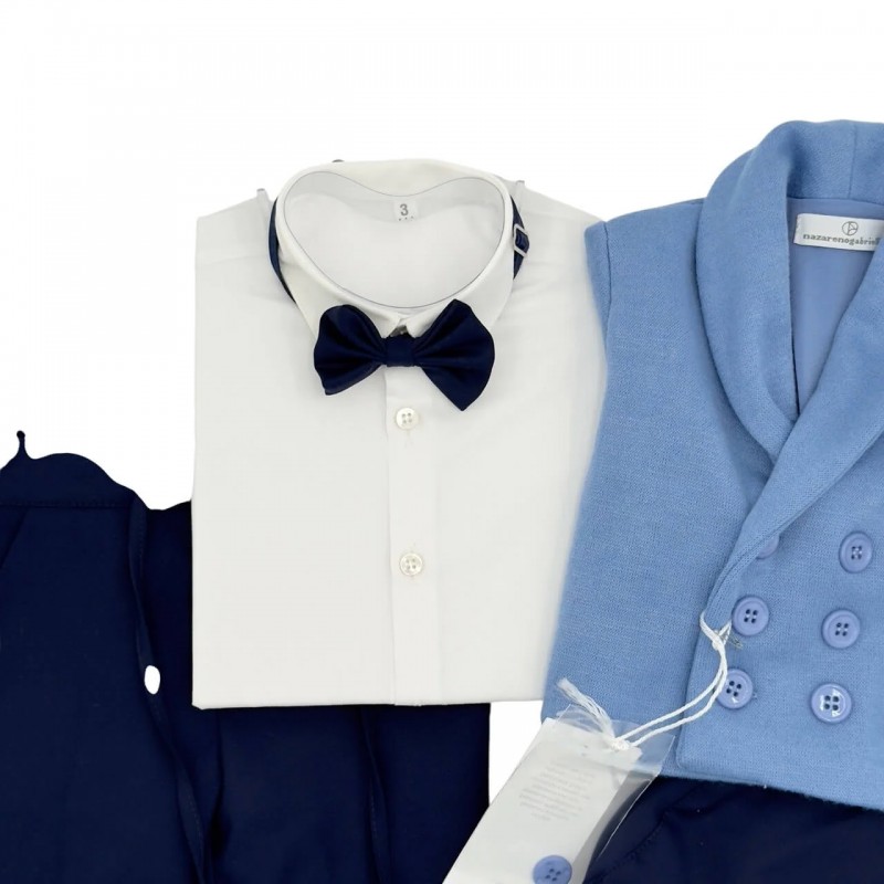 completo adatto per autunno e inverno, elegante e comodo. Il cardigan in morbida lanetta sarà come una carezza per tuo figlio, camicia in cotone, pantaloni in raso con elastico regolabile in vita e papillon abbinato