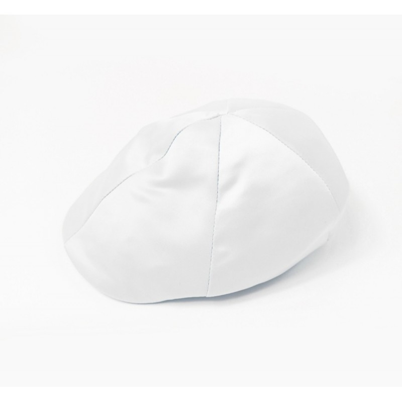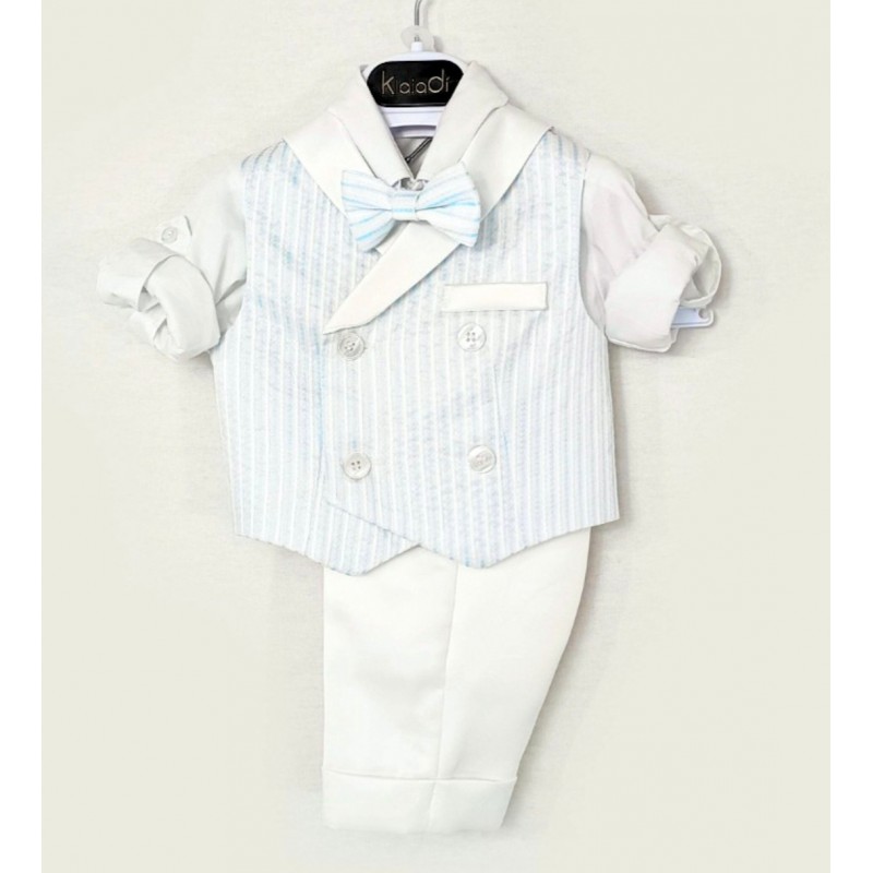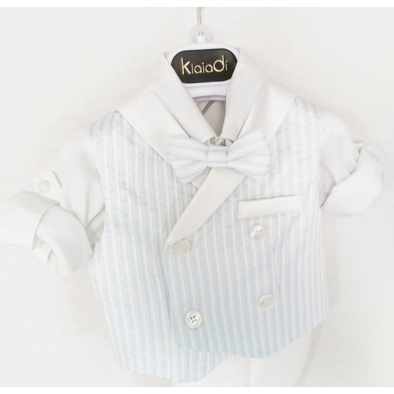 completo KLAIADì composto da pantaloni in raso bianco,gilet in cotone e raso a righe bianco-celeste, camicia bianca a maniche lunghe (che possono diventare corte grazie al bottoncino posto sopra il gomito) in cotone, papillon e coppola coordinati