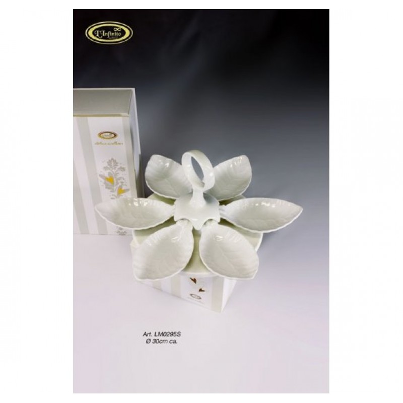 Aggiungi stile ed eleganza in tavola con questa antipastiera in porcellana composta da un vassoio grande (diametro 30 cm) con un comodo manico che rende più facile e pratico il trasporto dei tuoi antipasti e 6 piattini removibili a forma di foglia