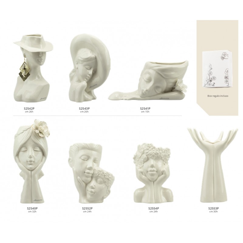 vaso "lady con viso tra le mani" in porcellana bianca e fiore con delicato filo dorato h32 cm circa