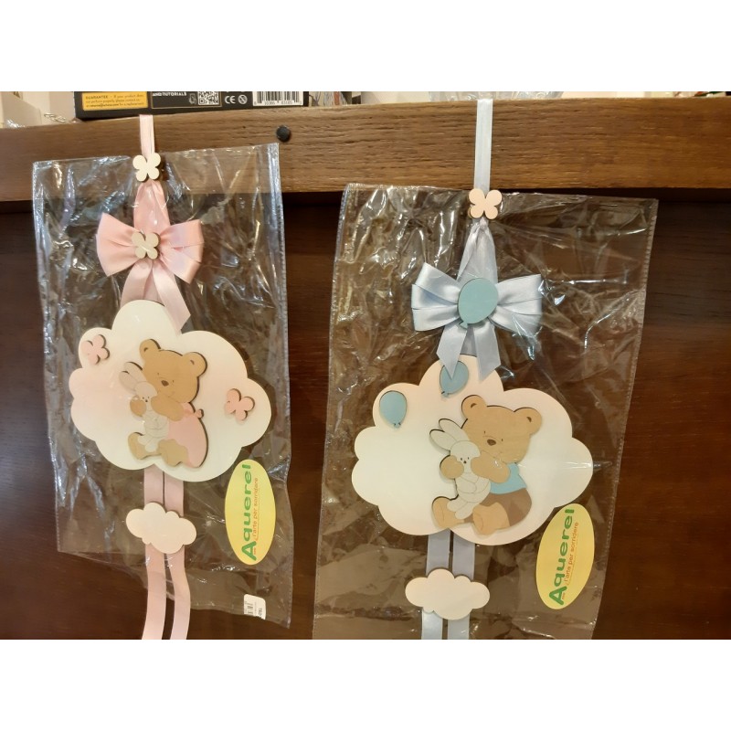 Fiocco nascita in legno mdf laccato con vernici atossiche all’acqua. Coccarda e nastro in raso e cotone. Lavorazione interamente artigianale italiana.