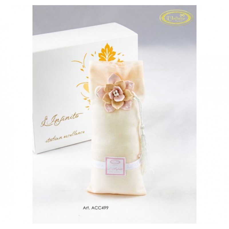 Sacchetto alto in misto lino avorio rivestito in tulle rosa con dalia in porcellana color rosa e crema