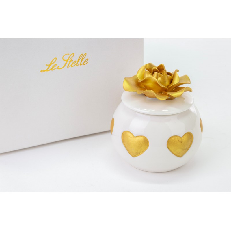 scatola cuori con rosa oro su coperchio in porcellana con astuccio coordinato
