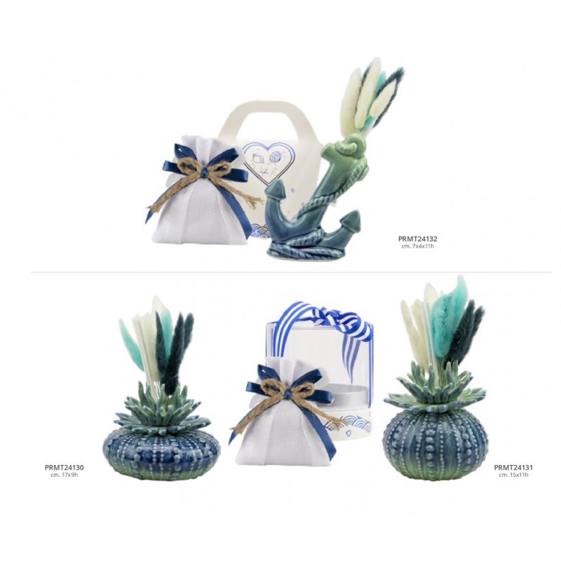 profumatore a forma di ancora in porcellana blu sfumata, h11x4x7 cm, con astuccio borsetta e bastonicini piumini come in foto