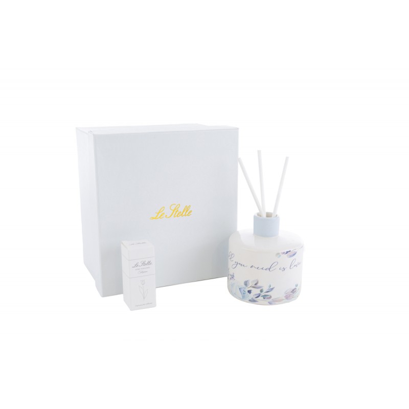 profumatore tondo in porcellana con essenza, bastoncini e astuccio coordinati