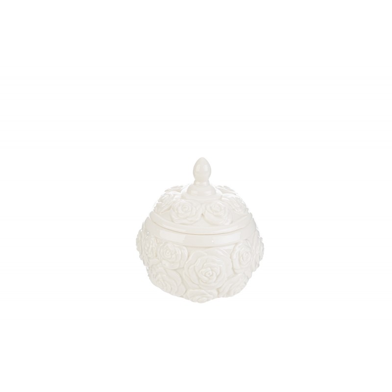 elegante scatola in porcellana bianca LE STELLE finemente lavorata a rose tono su tono in rilievo con candela profumata