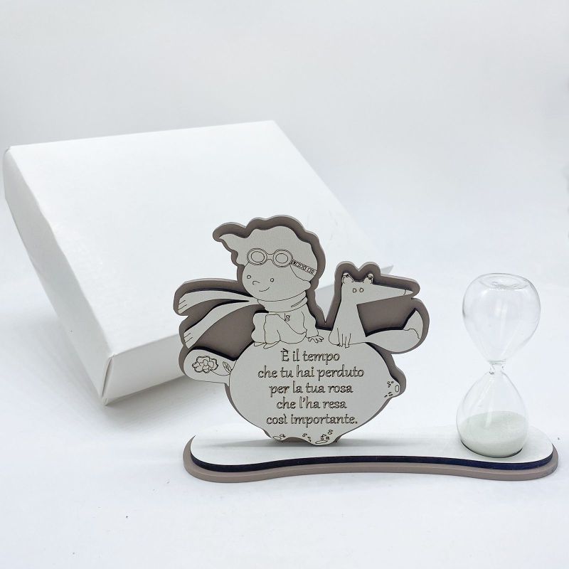 clessidra in vetro, h8 cm, su base in doppio strato di legno avorio e tortora con il piccolo principe 11x15,5 cm circa