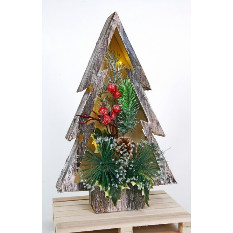 Stella-Albero-Slitta in legno con luce LED e decorazioni natalizie.